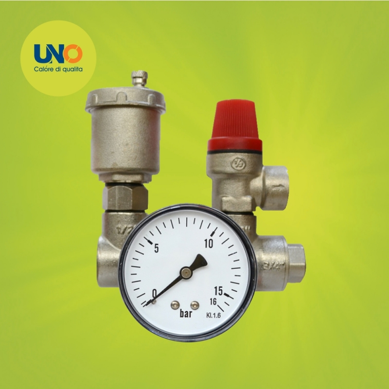 Включает в себя предохранительный клапан 1/2″ с порогом срабатывания 3 бара, автоматический воздухоотводчик (с запорным клапаном) и манометр, установленные на латунной консоли.