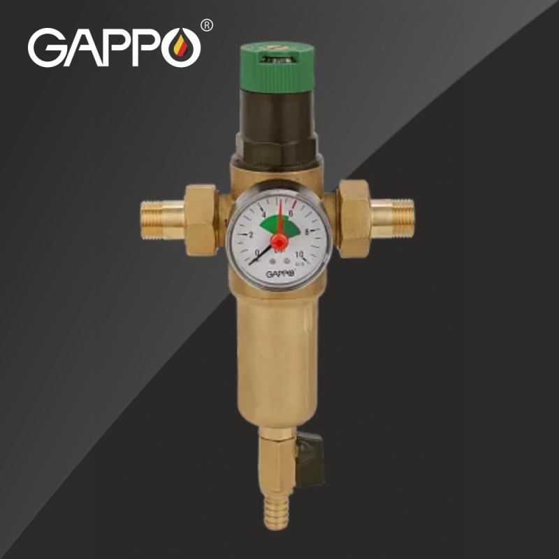 Фильтр промывной НР со встроенным поршневым редуктором давления для горячей воды Gappo, сетчатый, с манометром и дренажным краном