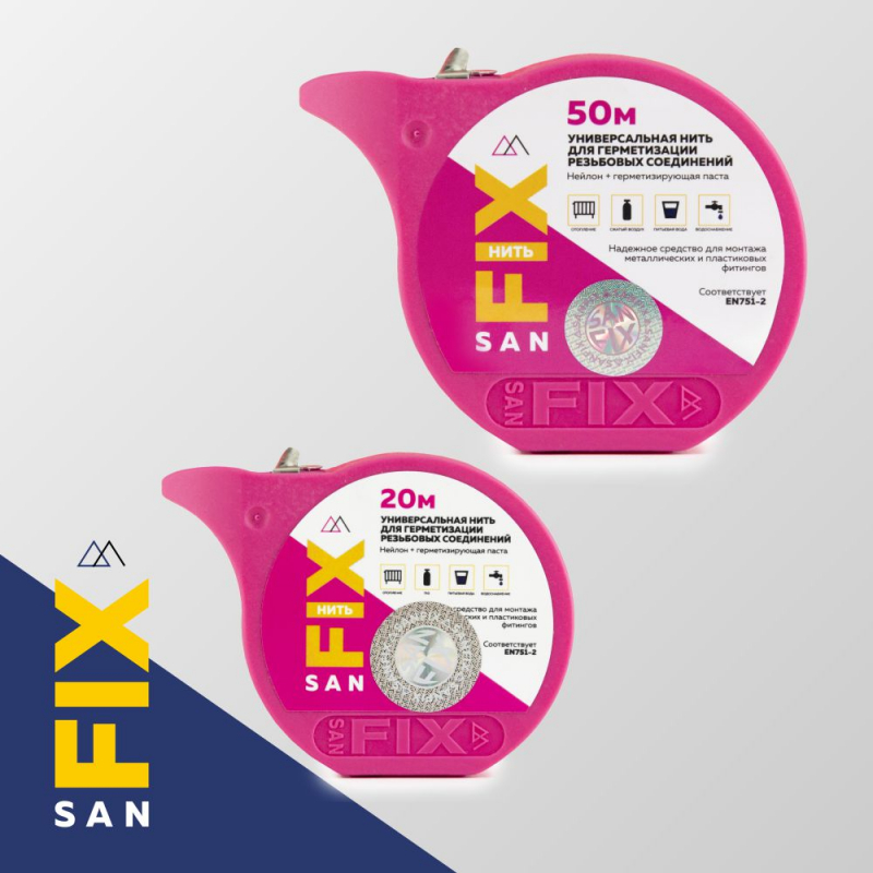 Для газа и воды. Нить универсальная для герметизации резьбовых соединений (нейлон+герметизирующая паста) SANFIX – нить нейлоновая, пропитанная герметизирующей пастой, универсальный герметик для соединений резьбового типа. Обеспечивает надежный монтаж металлических и полимерных фитингов.